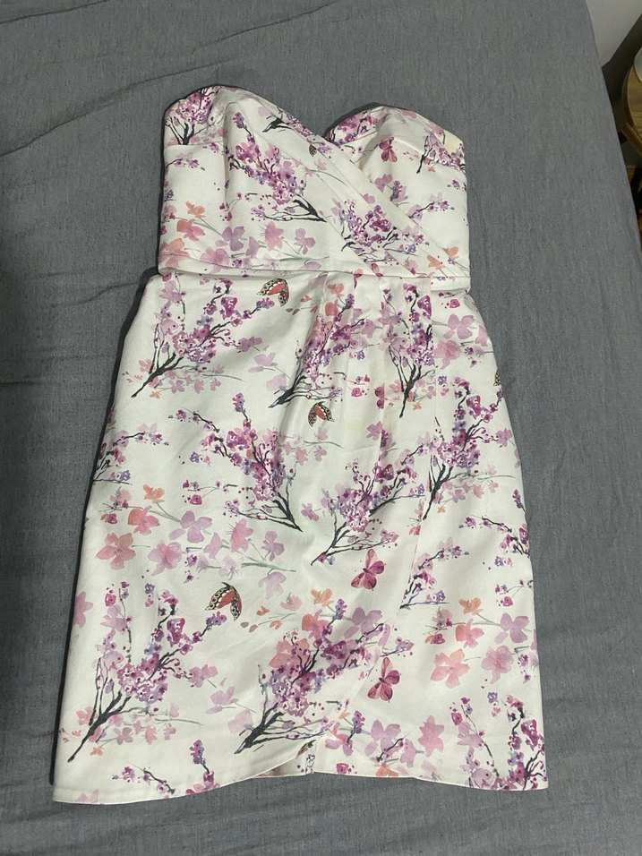 Pembe pastel çiçek desenli, straplez ve kolsuz, drapeli tasarıma sahip, vücuda oturan bohem tarzda nişan elbisesi.
