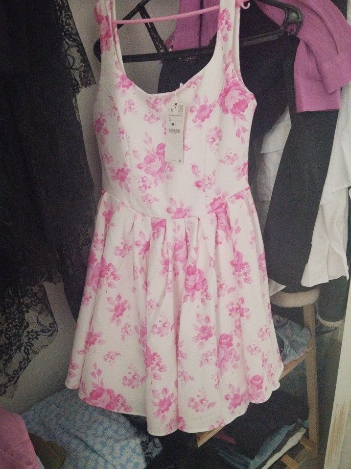 Pamuklu kumaştan, dantelli, straplez ve çiçek desenli pembe kısa elbise, rahat ve şık bir görünüm sunar.