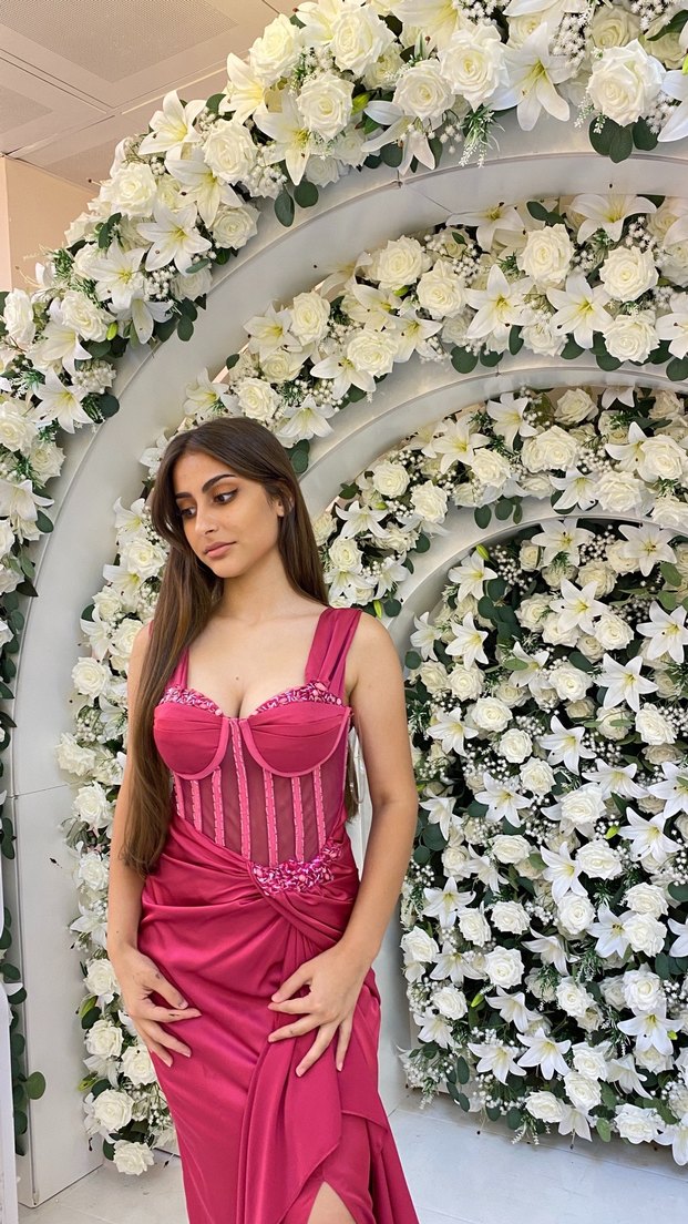 Pembe straplez uzun abiye elbise, drapeli detaylar ve çiçek desenleriyle düğünler için uygun, vücuda oturan kesime sahip. Kolsuz ve bohem tarzda.