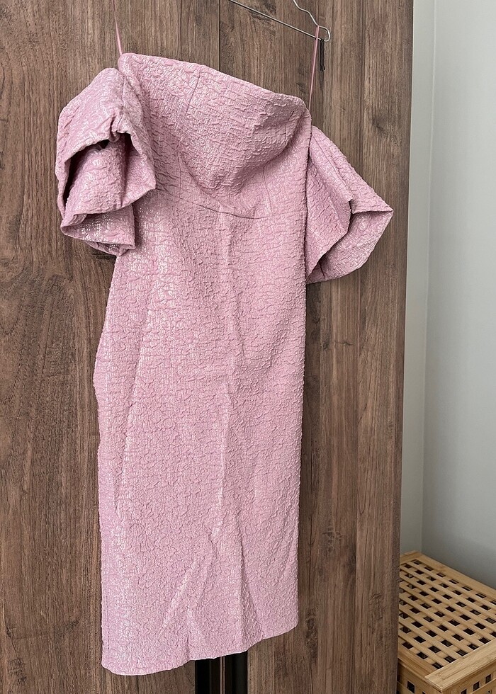 Pembe içinde altın ışıltılar var. 1 kez giyildi. Balon kollu straplez. Midi boy.