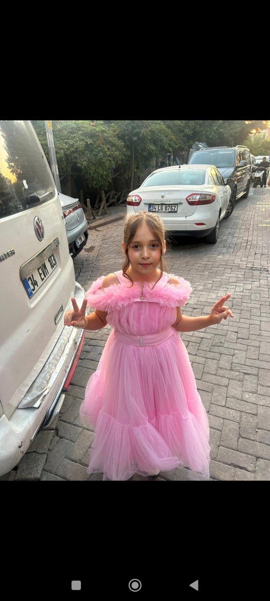 Pembe renkte, straplez yakalı ve fırfır detaylı, askılı kollu, baskılı desenli, vücuda oturan kız çocuk abiye elbise. temizdir bir kez giyildi sadece sorunu yok