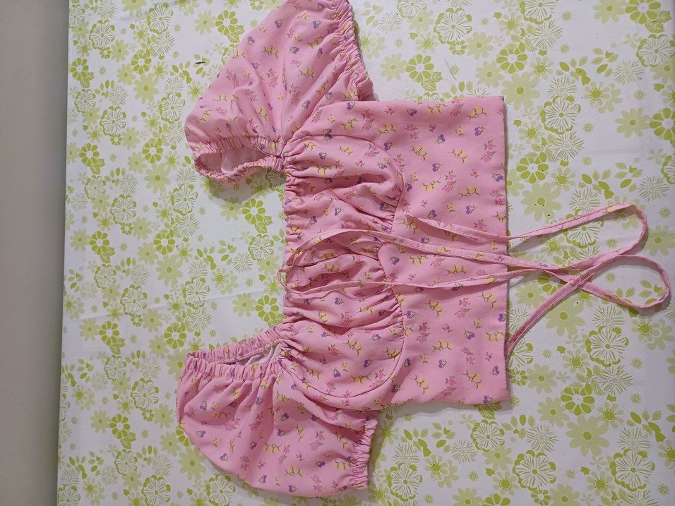 Pembe, straplez yakalı, fırfırlı detaylı, pastel çiçek desenli, kısa askılı ve bol kesim midi bluz. Günlük sokak stili için uygundur.