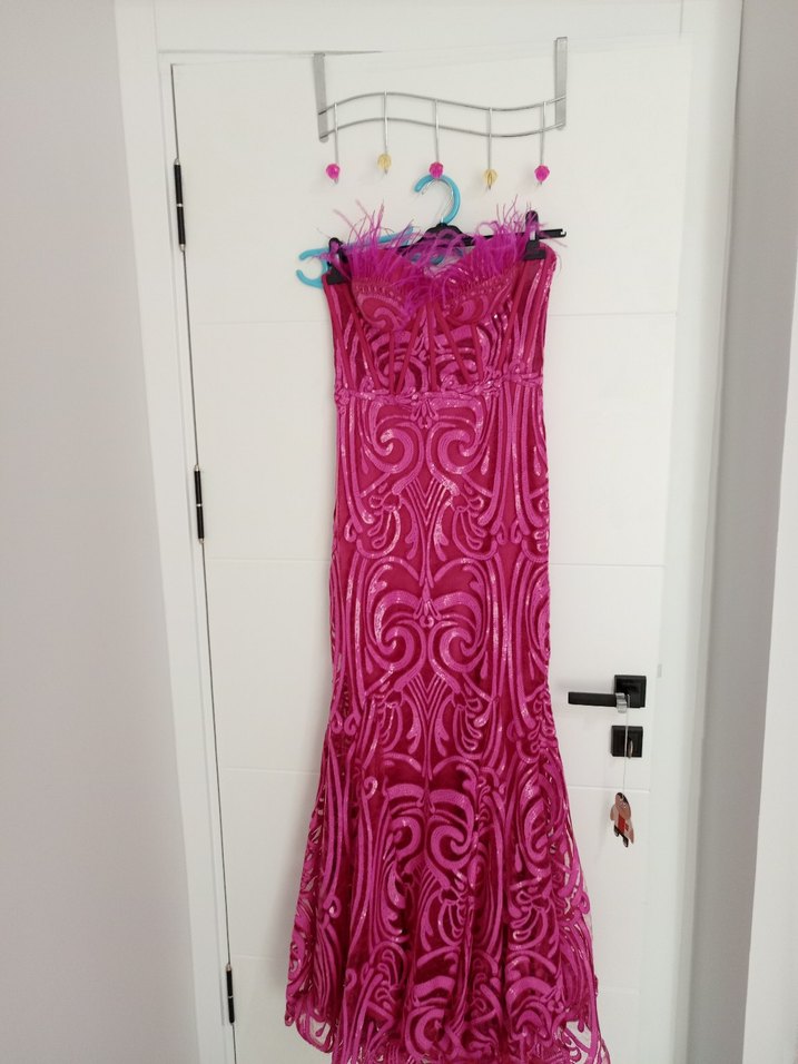 Pembe, straplez yaka, işlemeli ve dantelli uzun, vücuda oturan abiye elbise, kinamda 1 kere çok kısa giydim, ihtiyaç fazlasıdır,deformasyon yoktur,şeffaf askıları kesik sadece o kullanıma engel değil. Diğer urunlerimi de bakabilirsiniz. İade kabul etmiyorum