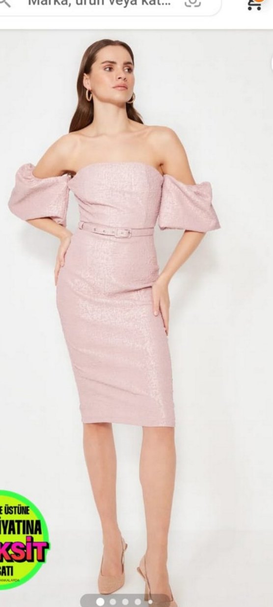 Pudra pembe renkte, straplez yakalı, kemerli ve strappy kollu, vücuda oturan midi uzunlukta kalem elbise. Romantik akşamlar için uygundur.