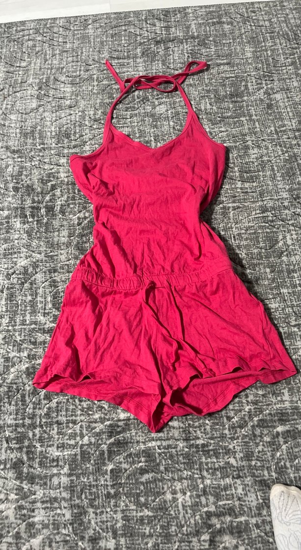 Keten kumaştan, pembe renkli, straplez ve kolsuz mini tulum. Bohem ve sokak stili, romantik akşamlar için uygun.