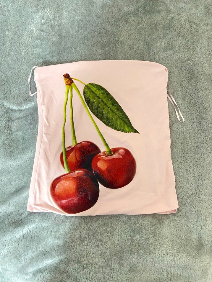 Pembe straplez kiraz baskılı crop top, yumuşak denim kumaştan, günlük rahat kullanım için uygun, fitted kesimle tasarlanmıştır.