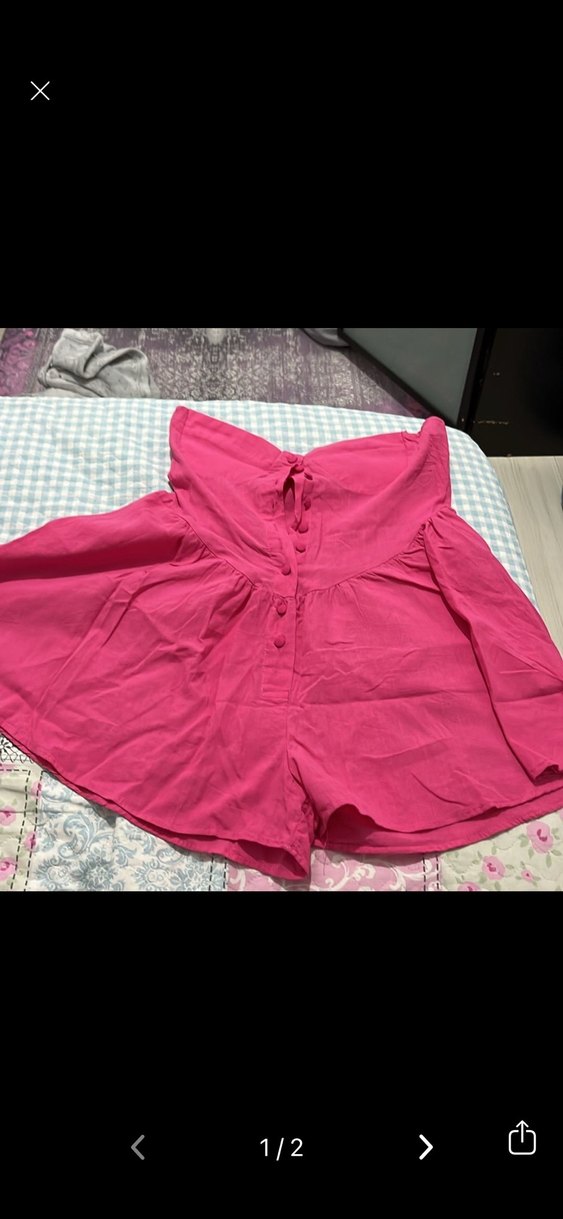 Pamuklu, pembe renkli, straplez yaka ve düğmeli önden kısa, bol kesim tulum.