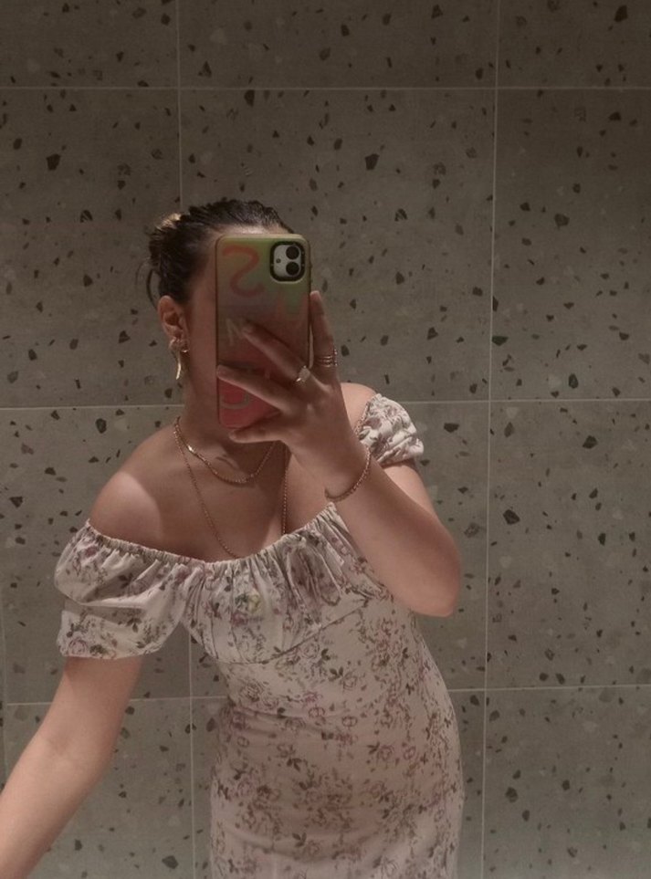 Pamuk kumaştan, pastel pembe tonlarında, straplez yaka ve kısa kollu, vücuda oturan midi boy bohem elbise. Şeffaf detaylar içerir.