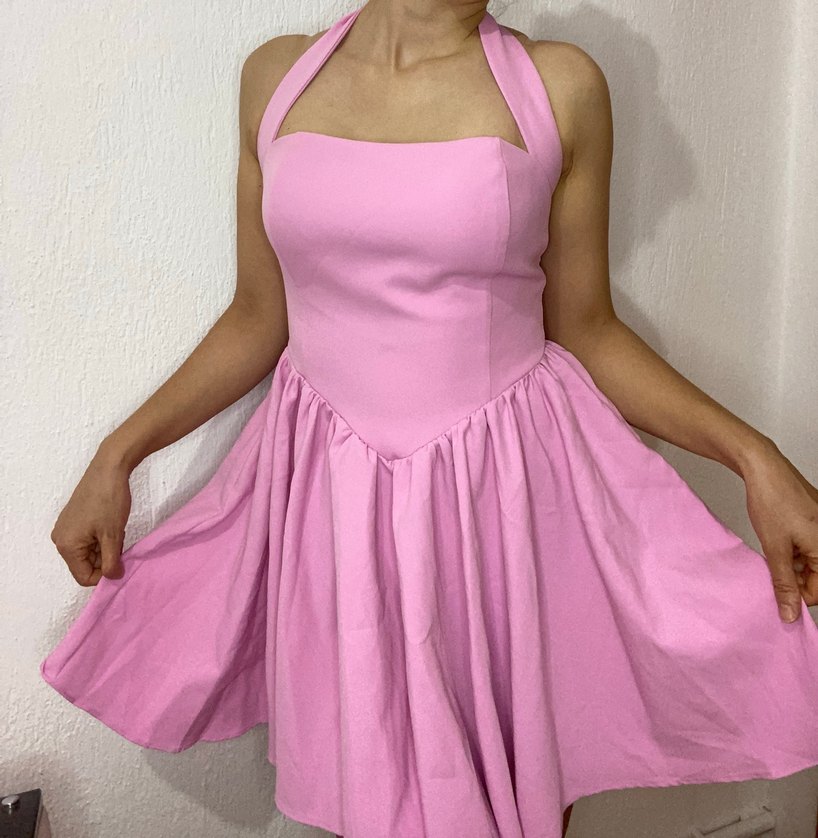 Pembe straplez yaka, askılı kollu ve drapeli etekli, yumuşak sentetik kumaştan yapılmış, normal boy midi elbise.