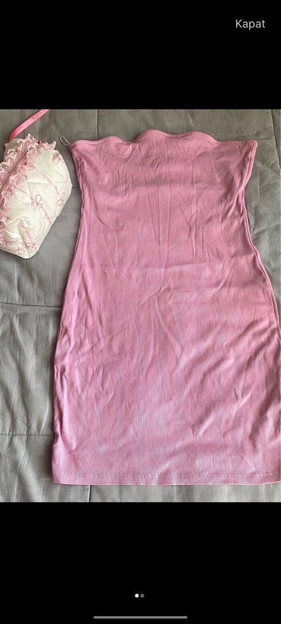 Pembe straplez midi elbise, vücuda oturan kesimi ve drapeli detaylarıyla. Yumuşak sentetik kumaştan, bohem ve retro tarzda günlük kullanıma uygun.