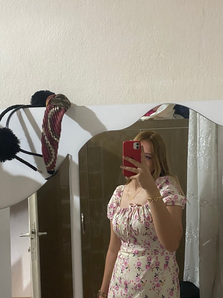 Pembe renkli, straplez yakalı ve kısa kollu midi elbise. Şeffaf, batik desenli ve yumuşak sentetik kumaştan üretilmiş, bohem ve retro tarzını yansıtıyor.