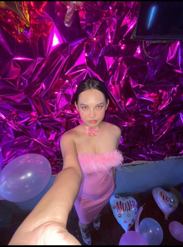 Pembe straplez, drapeli ve askılı kollu, pastel tonlarda tie-dye desenli, vücuda oturan midi uzunlukta parti elbisesi.