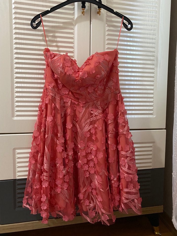 Pembe parlak nakışlı kumaştan, üç boyutlu çiçekli straplez abiye elbise. 38 beden, lise mezuniyeti için sadece 1 kez giyildi