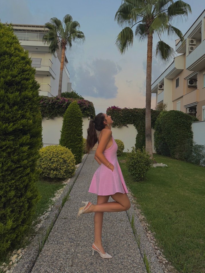 Straplez, mini ve drapeli bu pembe elbise, Paris tarzı normcore şıklığı sunar. Açık hava etkinlikleri için idealdir.