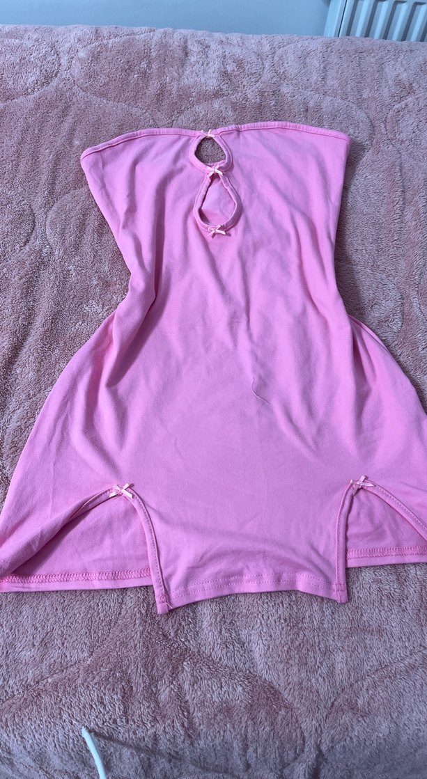 Pembe tonlarda, straplez ve kolsuz s beden sheınden aldım rengi bır tık daha koyu kuması penye tarzı birşey esnek guzel sheın den aldm mını cıft yurtmac var