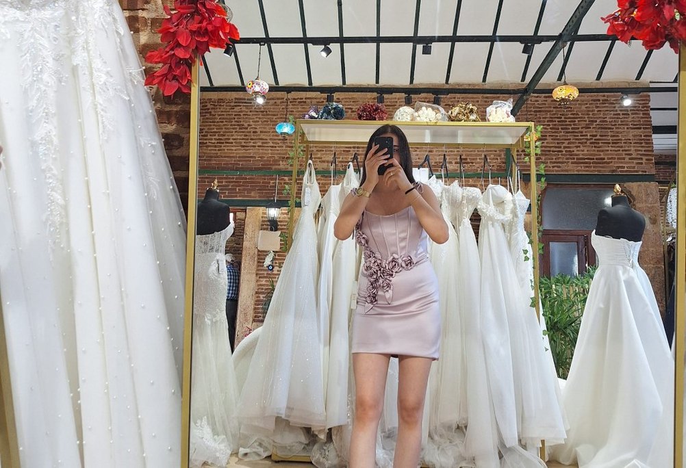 Pembe straplez mini gelinlik, midi boyda ve fitted kesimde. Pastel tonlarda, strappy kollu ve Paris tarzı avant-garde detaylara sahip.