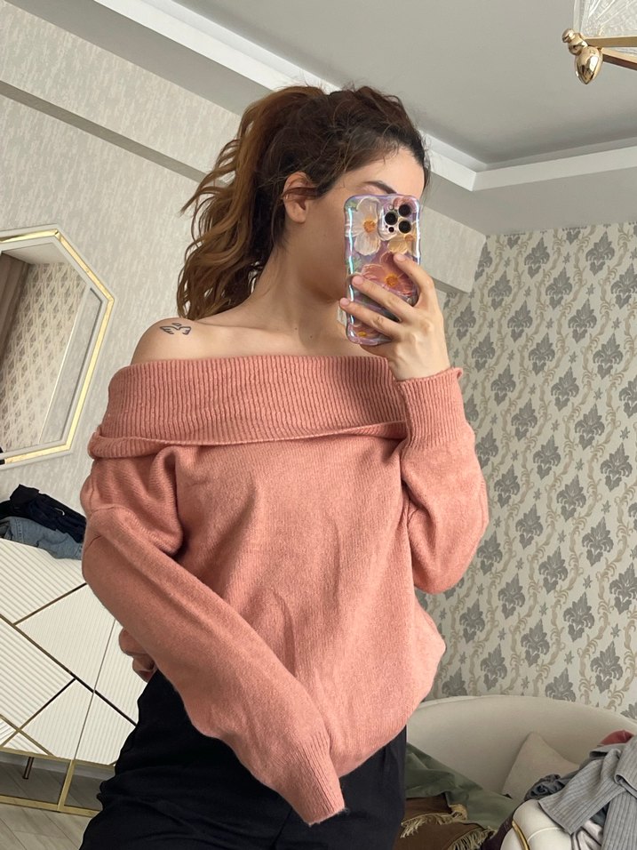 Pembe renkte, straplez ve kısa kesim triko kazak. Bol kesimli, uzun kollu ve rahat sokak stili için uygundur.