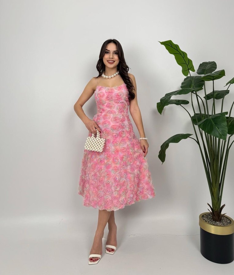 Pastel pembe vintage kokteyl elbisesi, straplez yaka ve ince askılarla dantel detaylıdır. Düzenli kesimi ve batik desenle düğünler için şık bir tercihtir.