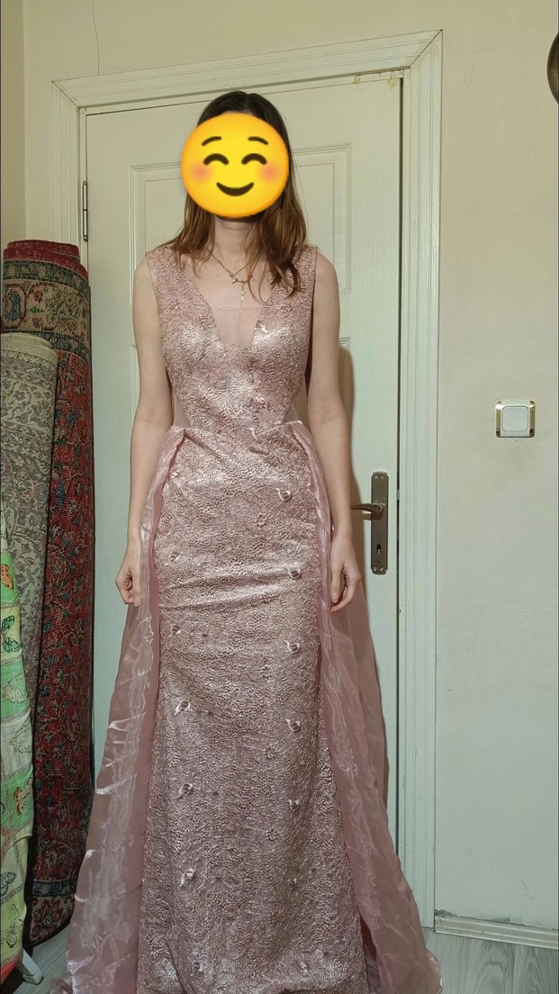 Pembe straplez uzun elbise, drapeli kumaş ve nakış detaylarına sahiptir. Bohem tarzda, bol kesimdir ve düğün gibi özel günler için uygundur.