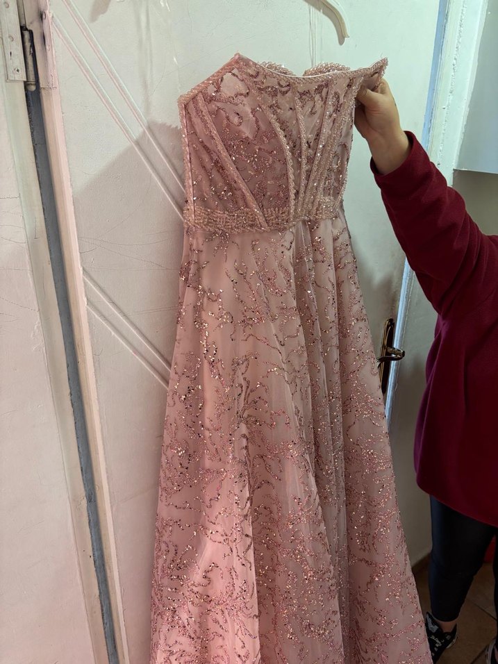 Açık pembe renkli, straplez, nakışlı dantel detaylı, uzun ve kolları açık abiye elbise. Klasik zarafeti bohem tarzıyla birleştirir, düğün için uygundur. Pazarlık payı vardır. Hiç giyilmedi 36 beden