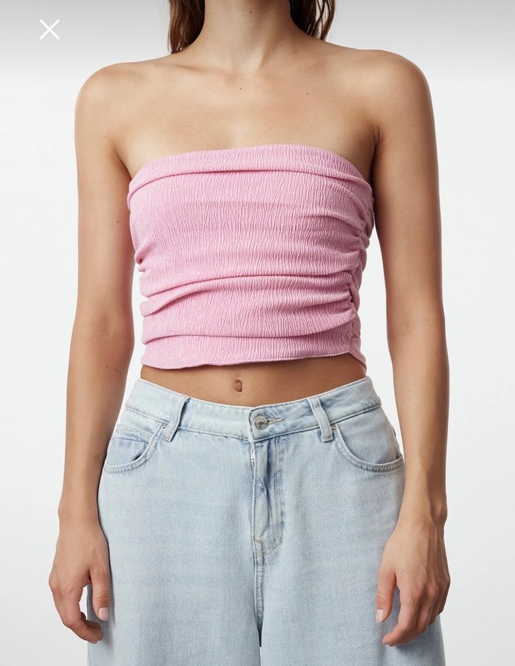 Hiç giyilmedi. Pembe renkli, straplez yaka ve pilili tasarıma sahip, fitted kesim crop top. Denim kumaştan, kolsuz ve kısa uzunlukta, günlük sokak modasına uygun.