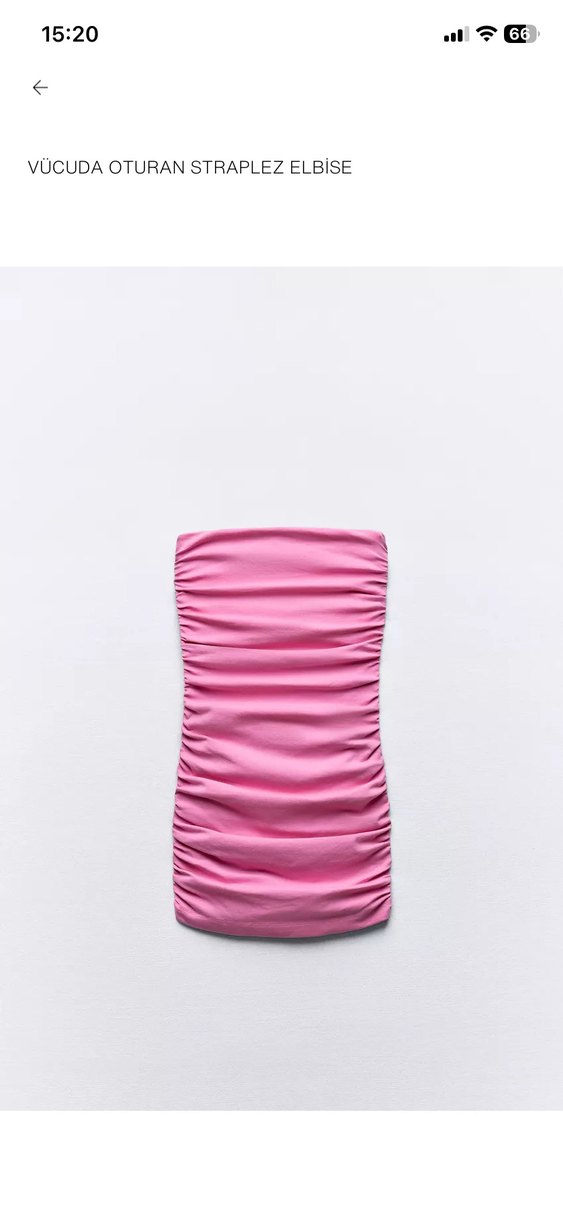Pembe renkli, straplez yakalı ve pilili tasarıma sahip, sentetik kumaştan yapılmış dar kesim mini elbisedir. Günlük kullanıma uygundur.