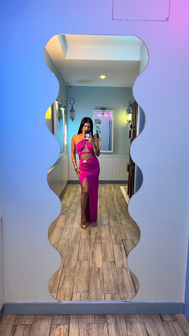 Pembe tonlarında tie-dye desenli, straplez ve askılı uzun saten elbise. Fitted kesim ve yırtmaç detaylı, romantik akşamlar için uygun.