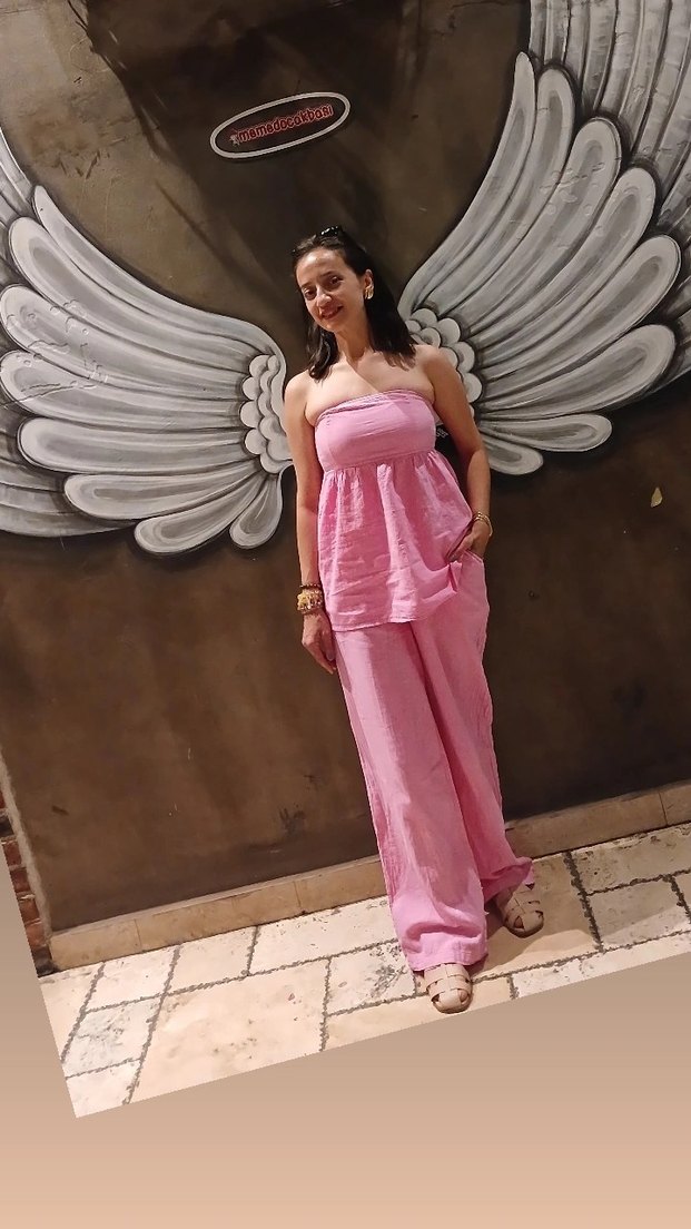 Uzun, pembe renkli, straplez kesim ve dökümlü ipeksi kumaştan yapılmış salaş. Bohem ve retro tarzlar için uygun, düğünlerde tercih edilebilir s ve m bedene uygundur . 1 kere giyildi temiz