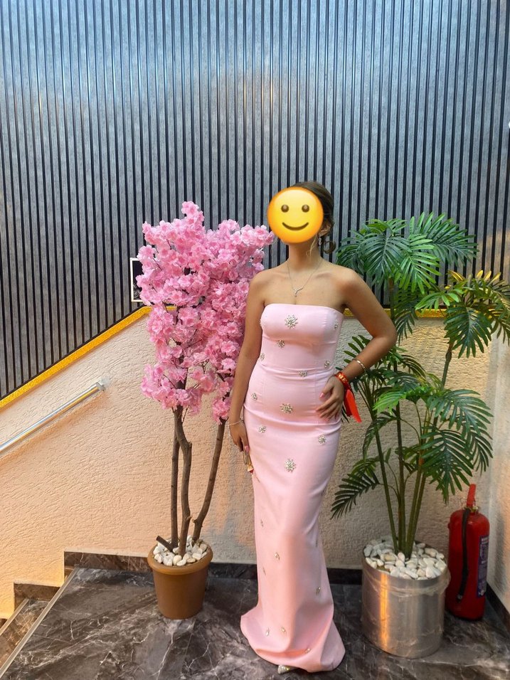Pembe, straplez, çiçek desenli, drapeli uzun ve dar kesim abiye elbise. Straplı detaylarıyla düğünler için göz alıcı bir seçenek ben sadece ablamın düğününde 3 saat giydim hiç bir leke vs hiç bir şeyi yoktur çok rahat kumaşı kaliteli ben 7000 liraya almıştım bi daha giycek bi yerim olmıca için satmak istiyorum