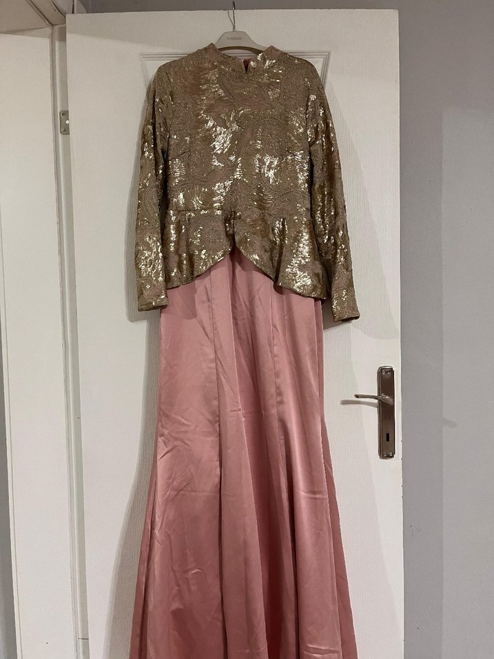 Pembe renkte, straplez yakalı ve uzun boylu, bol kesim abiye elbise. Güncel tarzda, drapeli ve parlak, düğün için uygun klasik şıklıkta, desensiz.