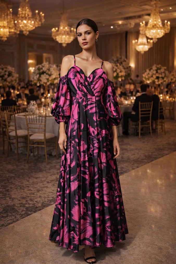 Uzun, straplez yakalı ve askılı kollu, bol kesim pembe batik desenli abiye elbise. Drapeli tasarımıyla romantik akşamlar için şık ve iddialı.