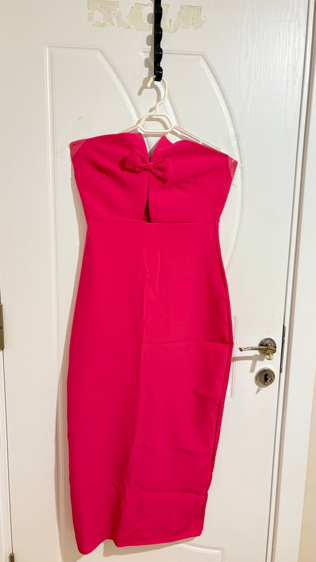Canlı pembe renkte, straplez ve kolsuz, uzun kesim ve belden oturan abiye elbise. Yaka kısmında fiyonk detayı bulunur. Romantik akşamlar için uygundur. EYYO marka yeni bir kere giyildi