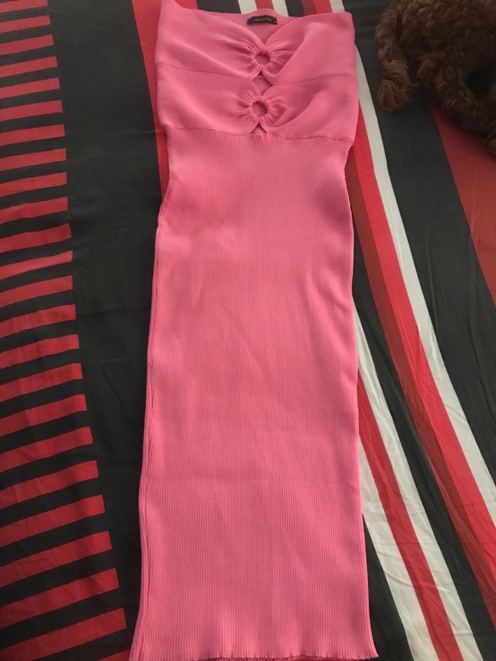 Pastel pembe straplez elbise, vücuda oturan kesimi ve pileli detaylarıyla dikkat çeker. Uzun boy ve kolsuz, sentetik kumaştan üretilmiştir.