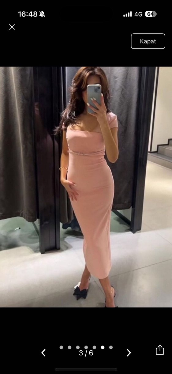Pembe pastel tonlarda, straplez yakalı, ince askılı ve kemerli, vücuda oturan uzun elbise. Romantik akşamlar için uygundur.