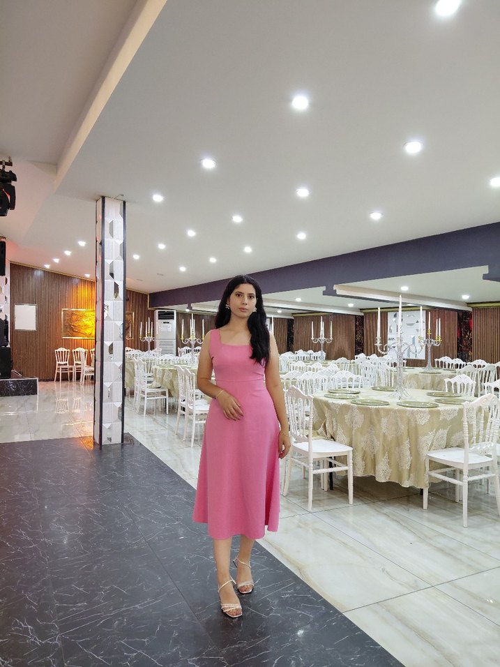 Pembe straplez uzun elbise, kare desenli ve ipeksi dokuda. Modern klasik ve minimalist tarzda, düğünler için ideal, rahat kesim. ✨