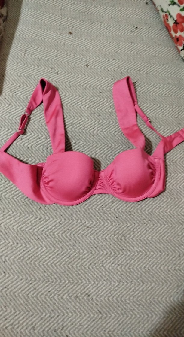 Pembe renkli, askılı ve vücuda oturan bikini üstü, günlük kullanım için şık ve cesur bir görünüm sunar. Desensiz ve sade tasarım.