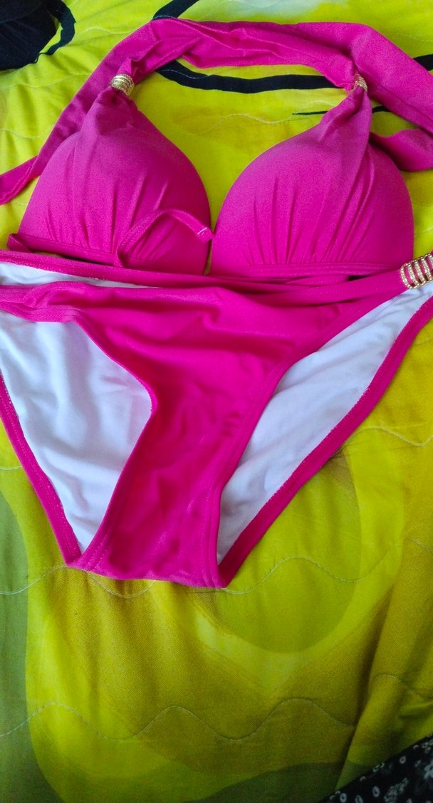 Pembe renkli, düğmeli ve strappy askılı, vücuda oturan kadın bikini takımıdır. Normal midi boyda, plaj için pop kültür athleisure tarzındadır.