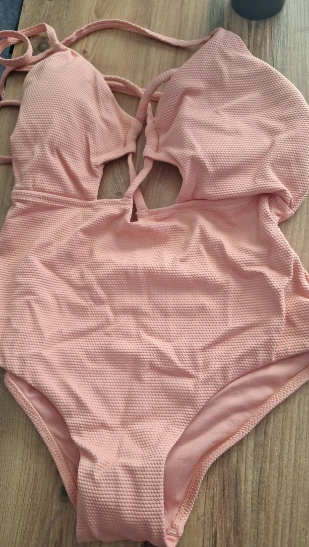 Pembe pastel tonlarında, strappy askılı, vücuda oturan kadın mayosu. Doku detaylı, midi uzunlukta, sahil için şık ve rahat bir tercih.