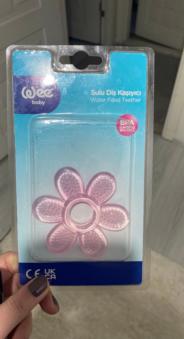Pembe çiçek şeklinde su dolu diş kaşıyıcı, bebeklerin diş etlerini rahatlatmak için tasarlanmıştır. BPA içermez, CE ve UK güvenlik standartlarına uygundur.
