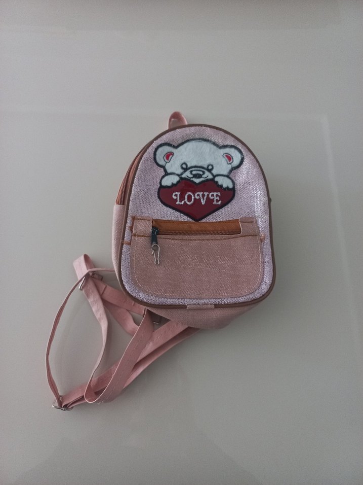 Pastel pembe süet malzemeden yapılmış, ayıcık desenli ve tokalı günlük kullanıma uygun kadın sırt çantası . marka temsili
