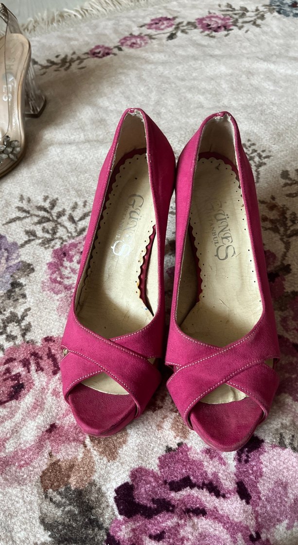 Pembe süet dolgu topuklu stiletto, parlak görünüm ve tokalı detayla, klasik zarafet ve düğünler için uygun.