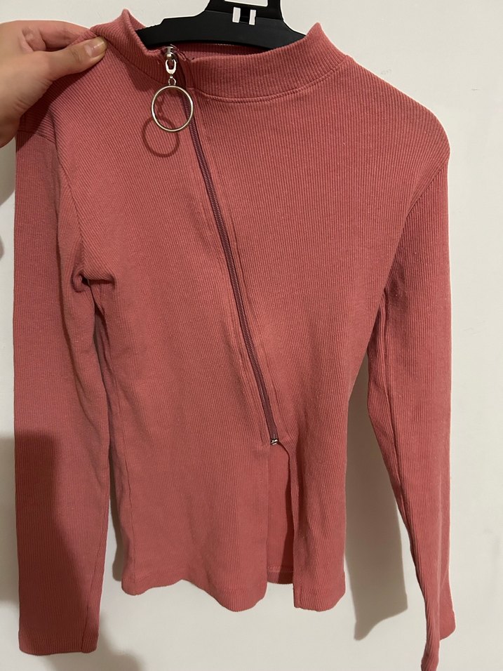 Pembe süet kumaştan, uzun kollu ve yüksek yakalı, çapraz fermuarlı, günlük kullanıma uygun rahat bir kadın kazak.