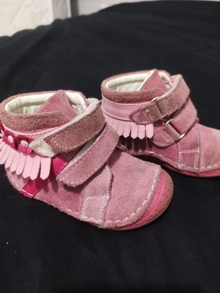 Pembe süet malzemeden yapılmış, fırfır detaylı ve nakış desenli bohem tarzda kız bebek ilk adım ayakkabısı. Yumuşak ve rahat yapıdadır.