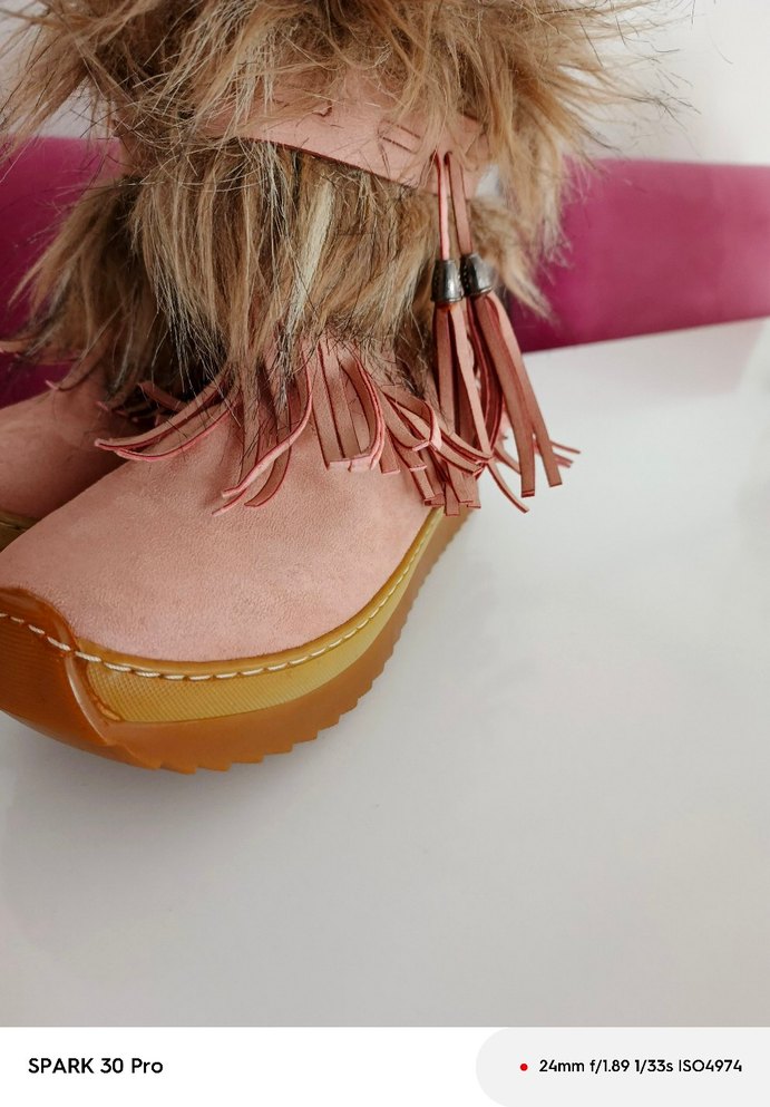 Pembe süet malzemeden yapılmış, kürk detaylı ve dolgu topuklu bohem tarzı kadın botları. Desensiz ve günlük kullanıma uygun.