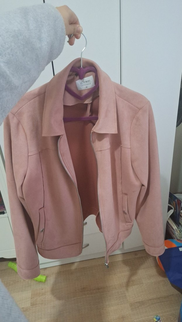 Pembe süet kumaştan, oturmalı kesime sahip, uzun kollu ve çıtçıtlı midi uzunlukta kadın ceket. Günlük rahat sokak stili için uygundur.
