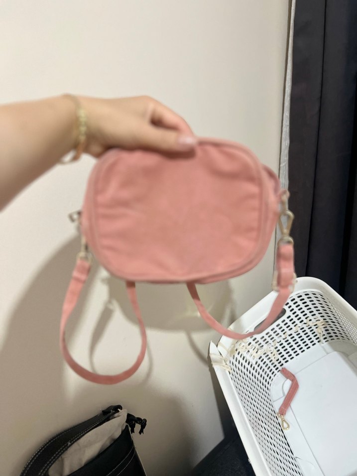 Pastel pembe renkte, süet kumaştan yapılmış, tokalı kayışa sahip kadın omuz çantasıdır. Trend sokak giyimi için uygundur.