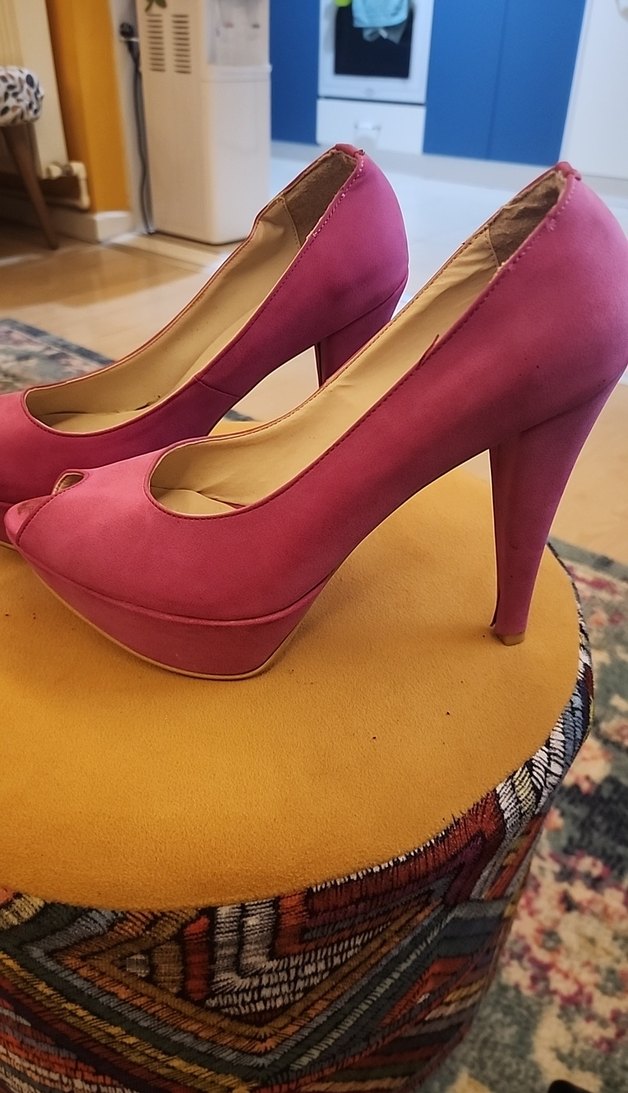 Kadınlar için pembe süet malzemeden, yüksek topuklu, tokalı detaylı canlı renkli stilettolar. Romantik akşamlar için cesur ve modern tarz.kusurları fotodaki gibidir