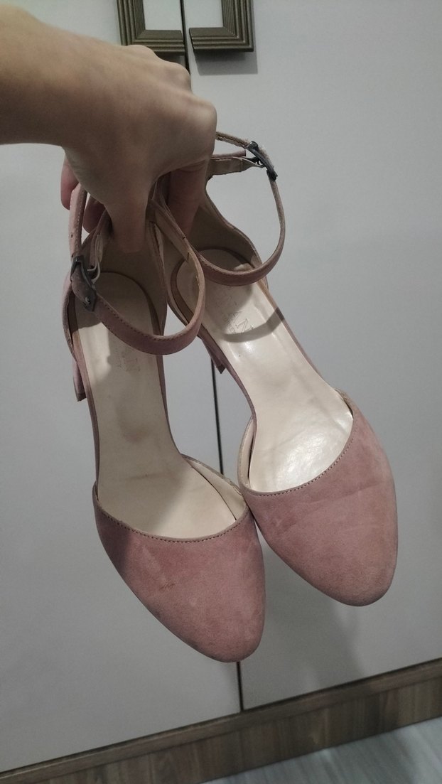 Pembe süet malzemeden, tokalı kayışlı, modern ve desensiz topuklu kadın ayakkabısı. Günlük kullanıma uygundur. Defosu yok.