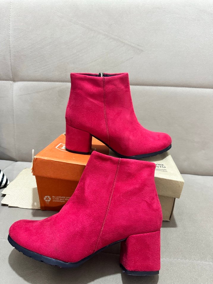 Pembe süet kadın topuklu botlar, blok topuklu ve desen içermeyen renkli tasarımıyla günlük kullanıma uygun, zahmetsiz şıklık sunar. Trendy ve rahat tarz için ideal.