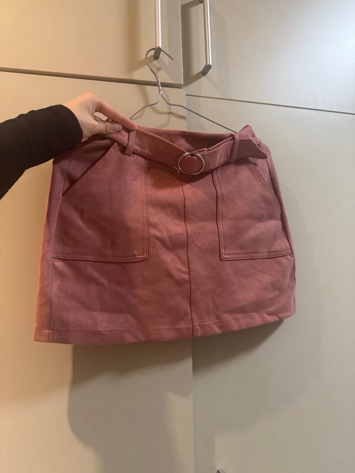 Pembe süet kumaştan, kemerli ve cepli, sade tasarımlı, günlük kullanım için uygun, dar kesim mini etek. Arkasında çok minik bir hasarı var. Etiketi sökülmüştür. (öğrenciden satılıktır)